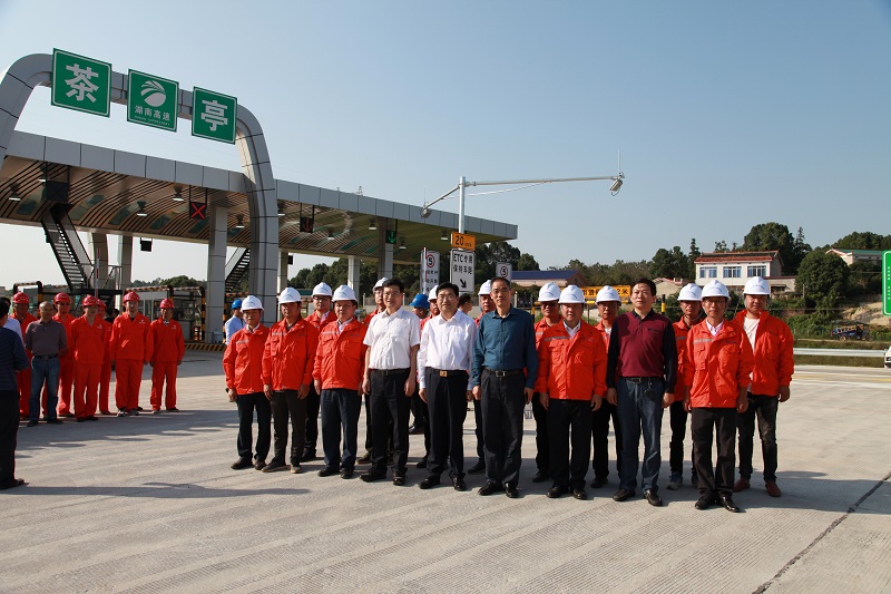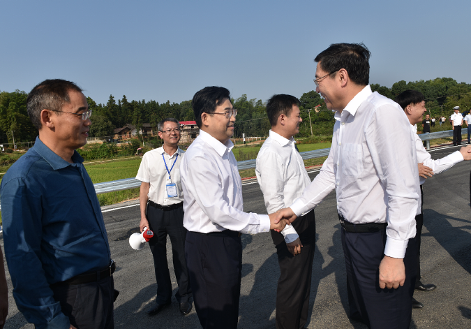 9月29日下昼4时许,省委书记、省人大常委会主任杜家毫一行在岳望高速茶亭收费站前坪,亲热慰问岳望高速建设者代表们,与交水建集团党委书记、董事长方联民,党委副书记、总司理胡建华,集团党委书记、董事长杨雄伟等亲热握手并宣布通车 。